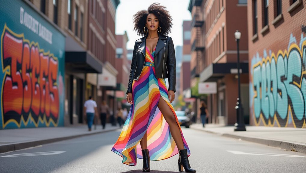 Rocking a concert outfit means embracing vibrant prints and bold colors that capture attention. Think flowing maxi dresses with tropical florals or geometric patterns that let your personality shine. Pair them with stylish ankle boots or comfy sneakers for the perfect balance of chic and comfort. Don’t forget layered statement necklaces and oversized earrings to elevate your look. You can also mix cultural heritage pieces for unique flair. There’s so much more to explore for your perfect concert ensemble!
